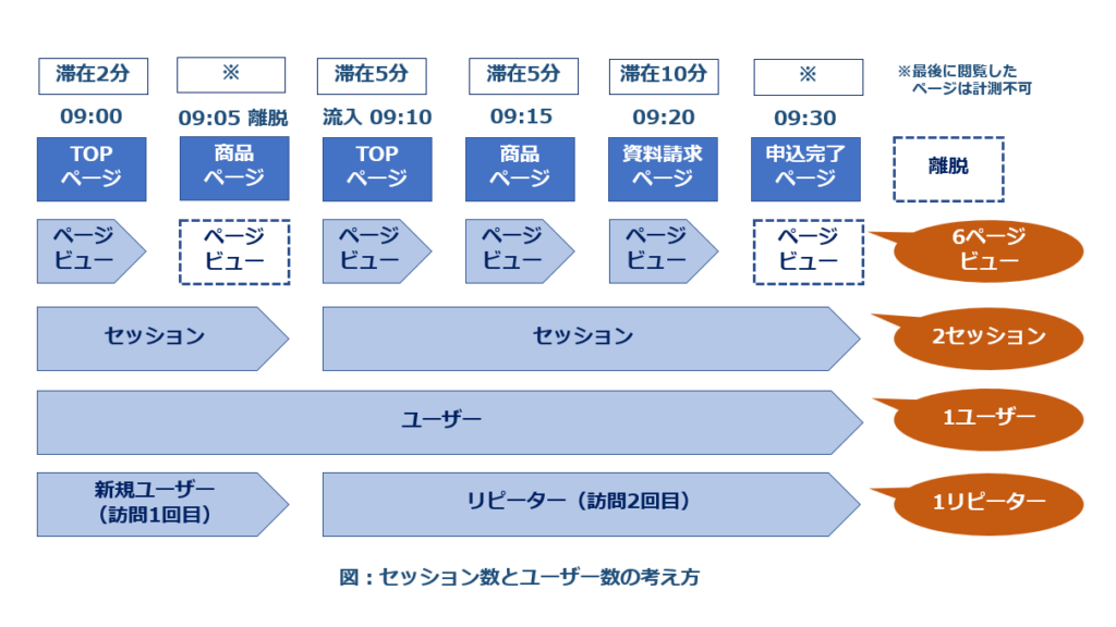 基本用語を理解したら、下記の図からページビュー数、セッション数、ユーザー数を考えてみよう