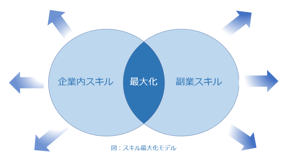下図をご覧の通り、企業内で培った又はこれから学ぶスキルと副業から学ぶスキルを最大化し、更に掛け合わせることによって専門性を高め、ご自身のマネタイズ力を高めることができます。ポイントは企業内と副業とで必要なスキルの方向性を合わせることです。そうすれば、レバレッジ(倍率)を効かせることができるでしょう。